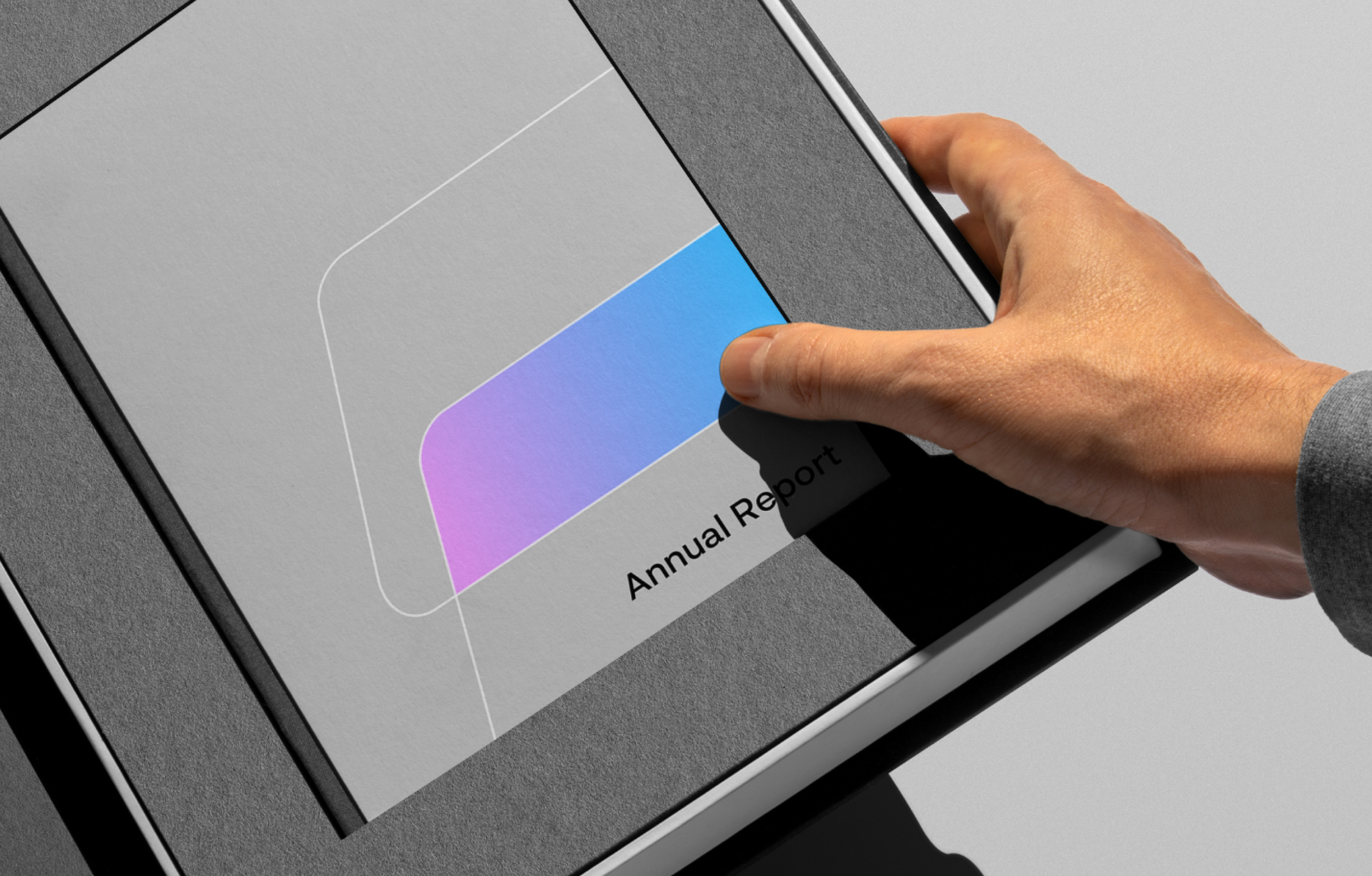 The design system is based on panels that recall digital devices and payment cards. Their overlapping forms express interaction, transparency, and choice. Gradients and outlines add depth and variation, while layouts keep the focus on usability and consistency.